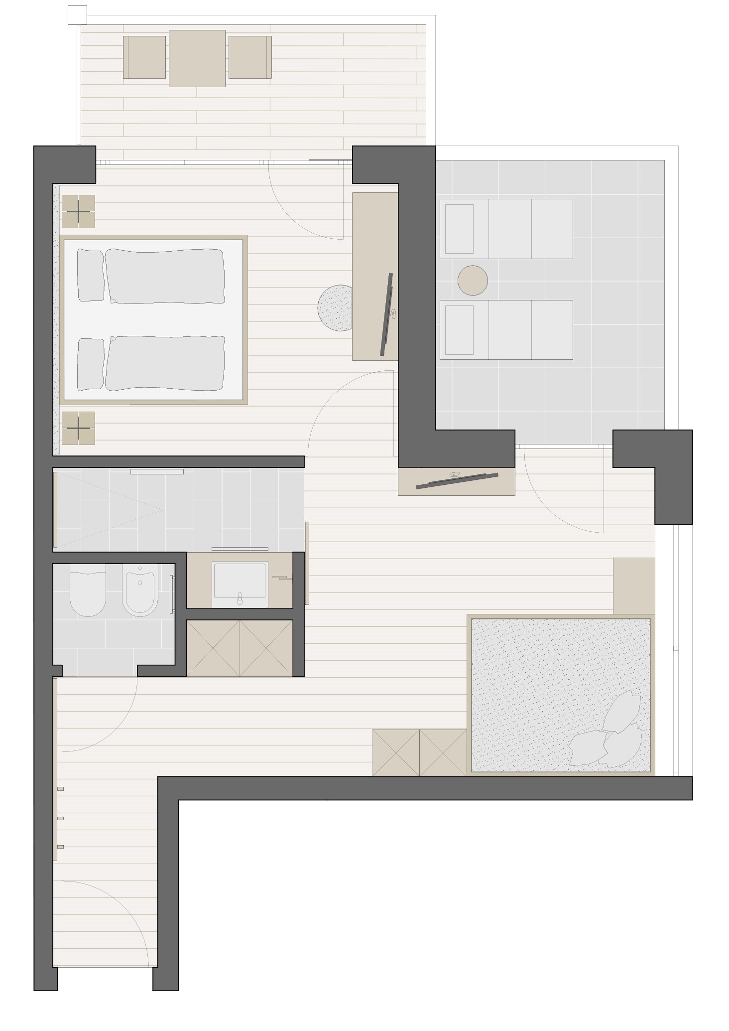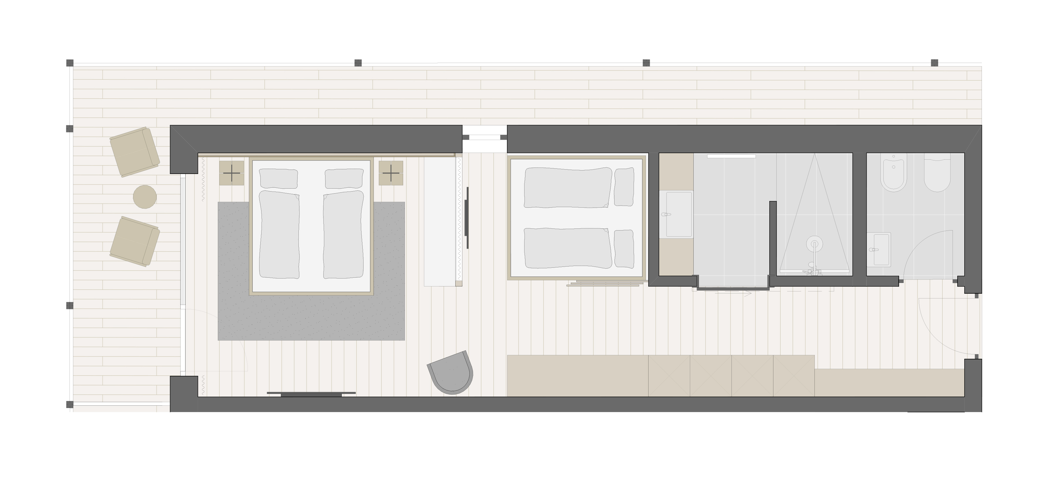 Le Suite di 45m² sono ideali per famiglie e coppie e sono dotate di una camera da letto e soggiorno separabile con un letto matrimoniale, angolo relax, angolo relax in mansarda, scrivania, bagno con doccia, WC staccato, pavimento in legno, balcone, TV, cassaforte, telefono, connessione Wi-Fi gratuita, asciugacapelli, specchio per truccarsi, musica in bagno, piccolo guardaroba, un posto auto riservato in garage. La Suite offre una vista verso sud-ovest sul Plan de Corones.