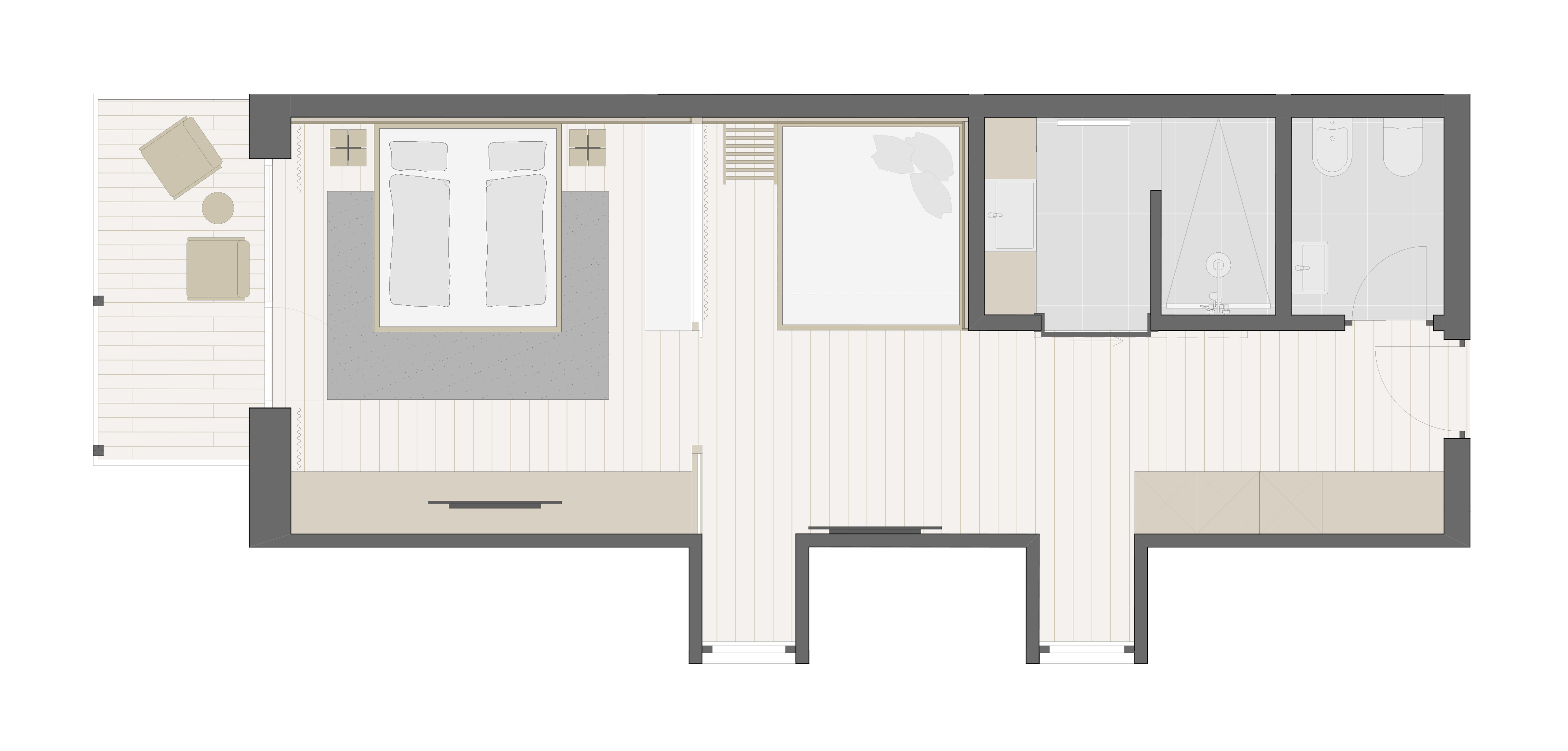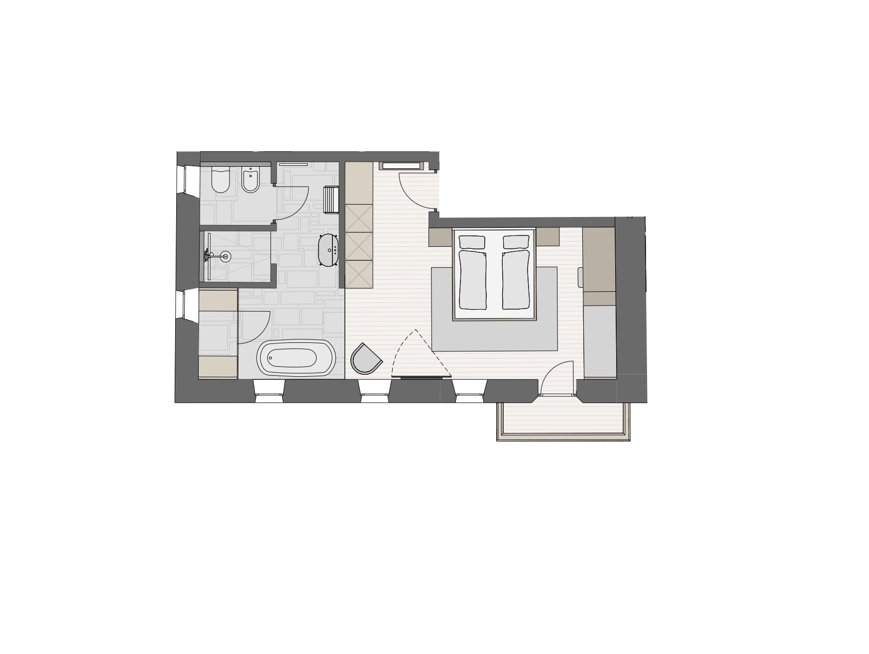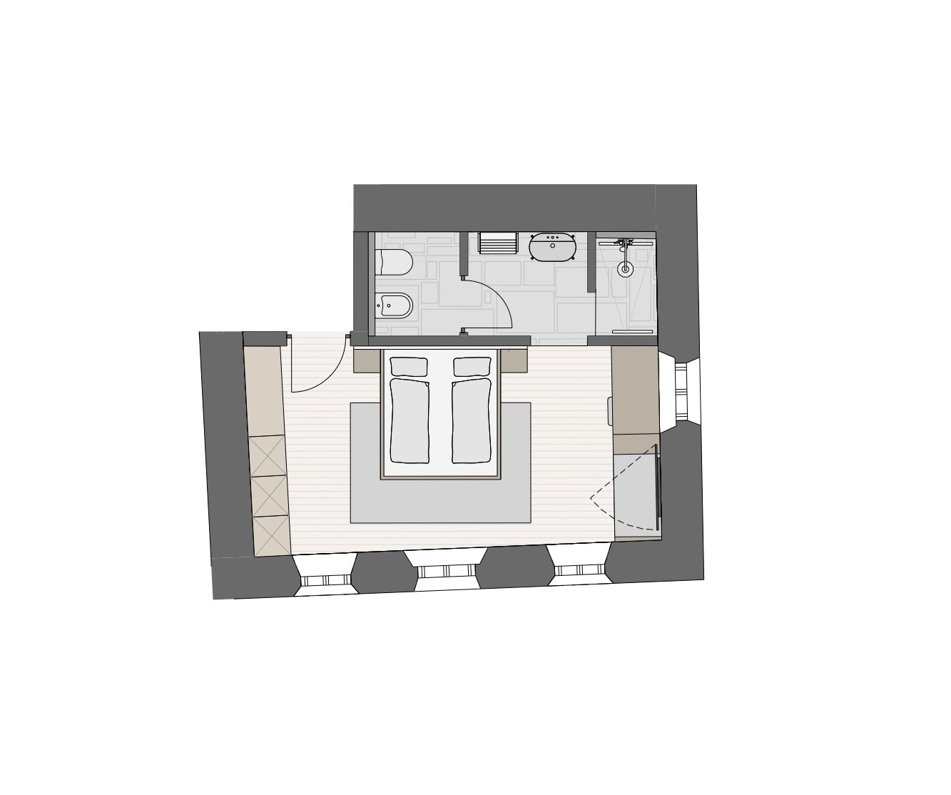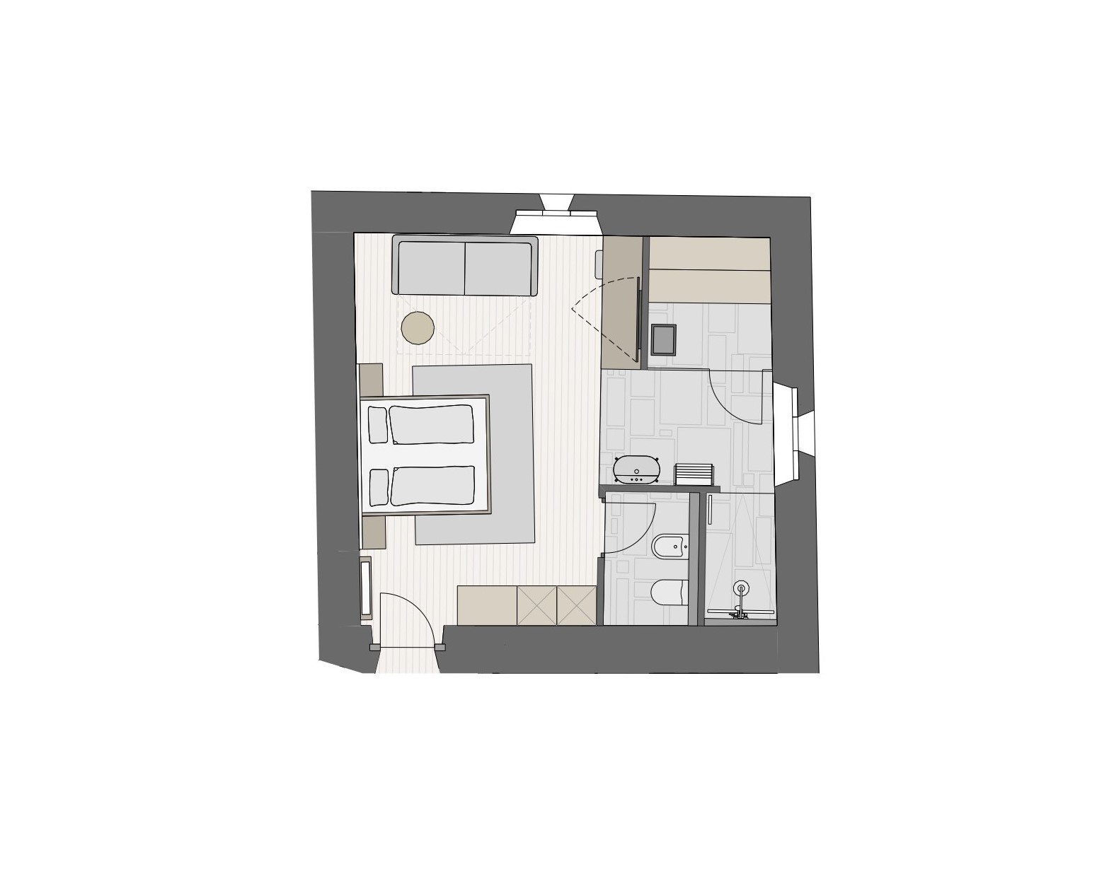 Nella Junior Suite di 33m² si fa rinascere la storia. Secondo l’idea "il vecchio incontra il moderno", si presentano il camino storico restaurato inattivo, muri storici e finestre rustiche in combinazione ad un design interno moderno.