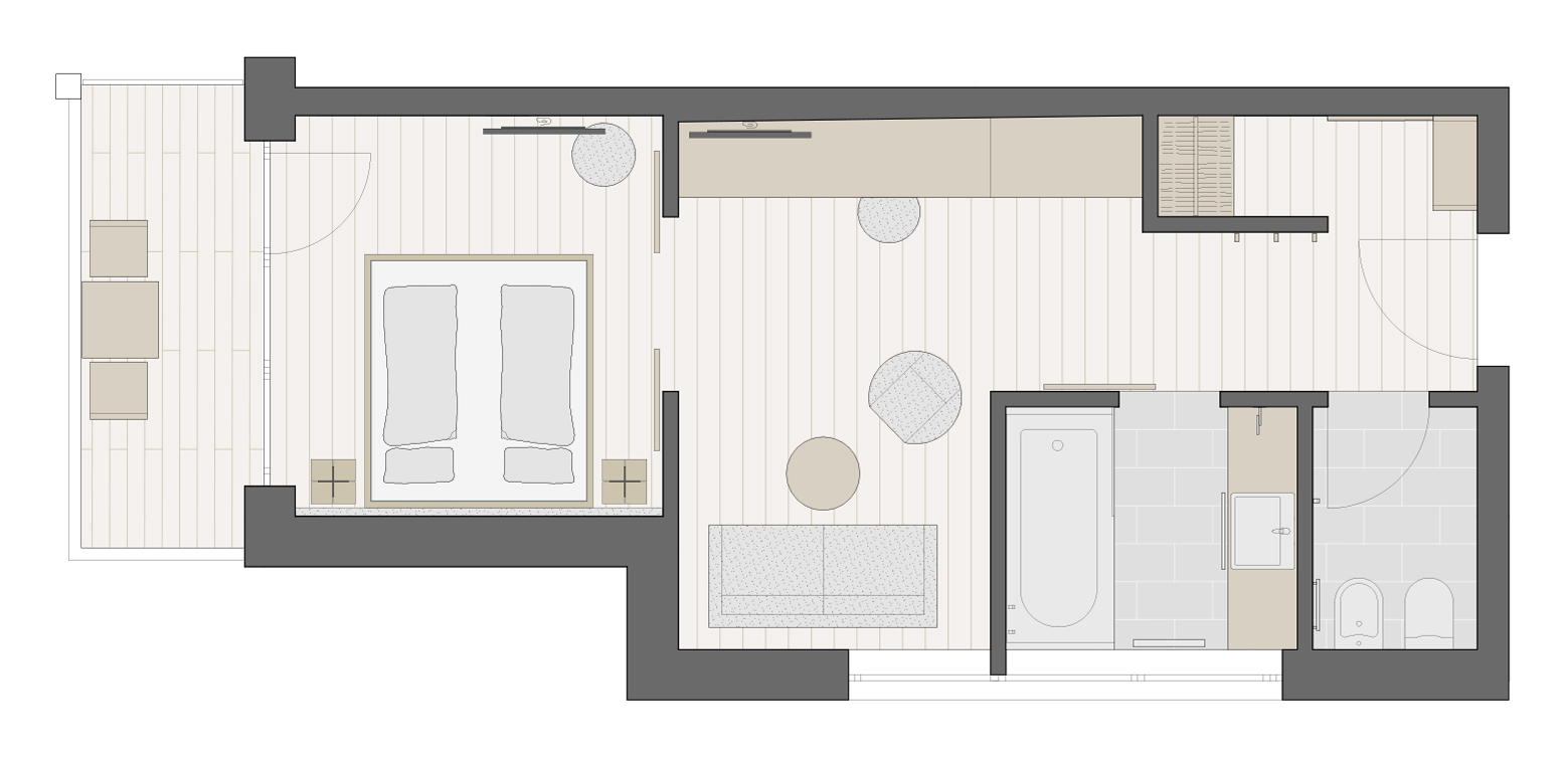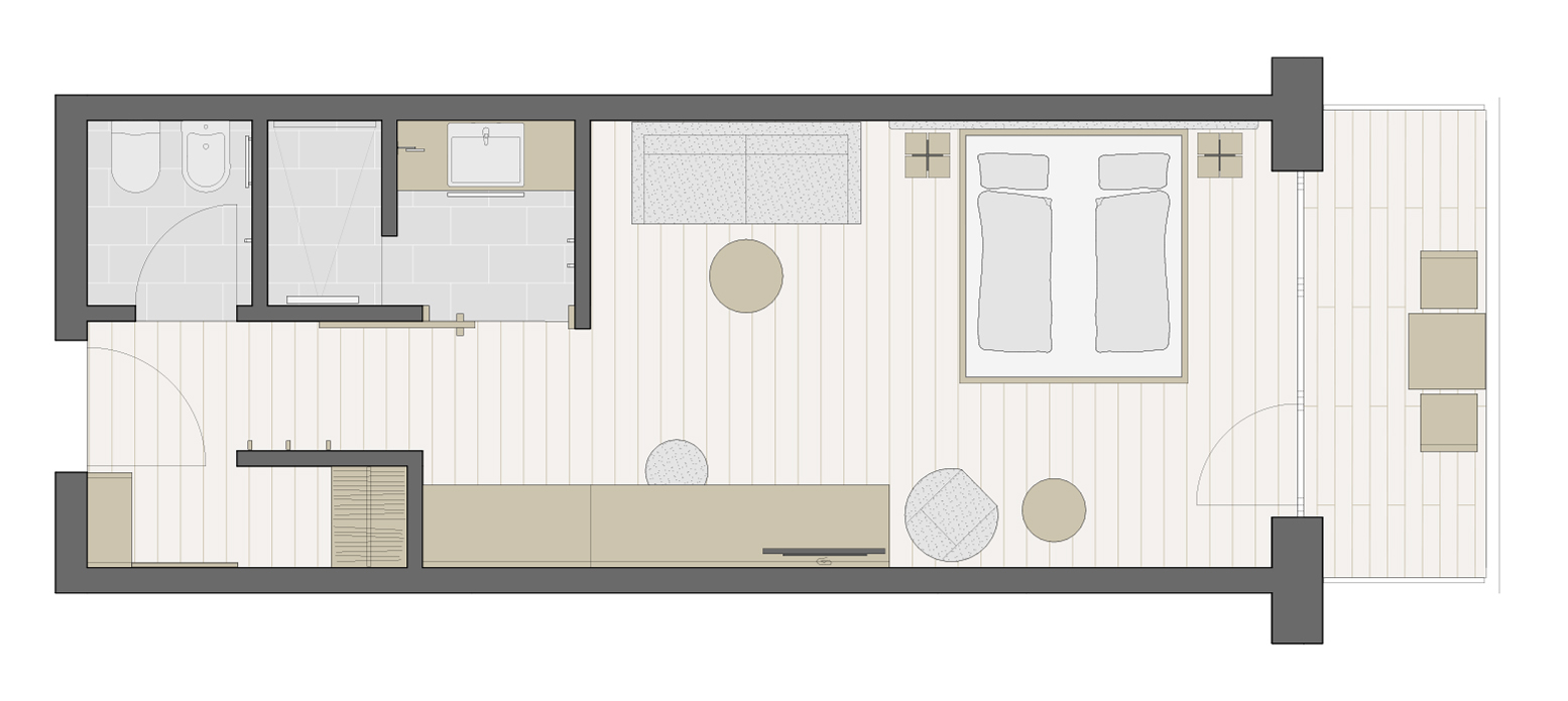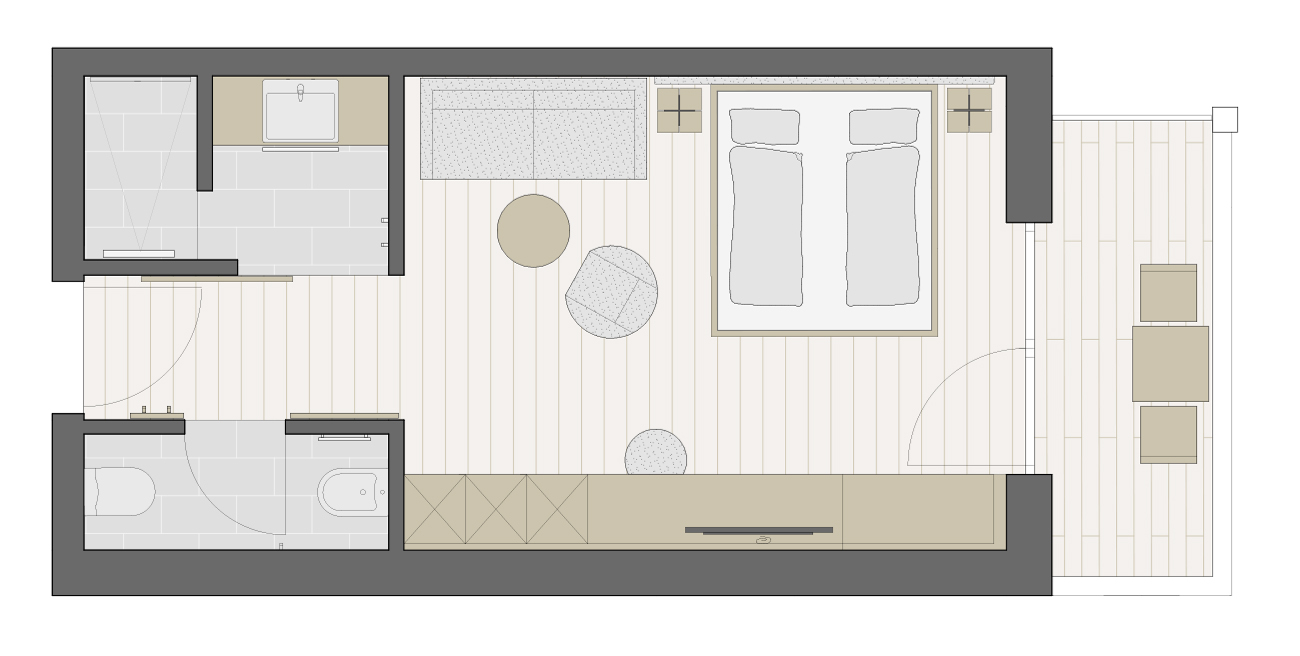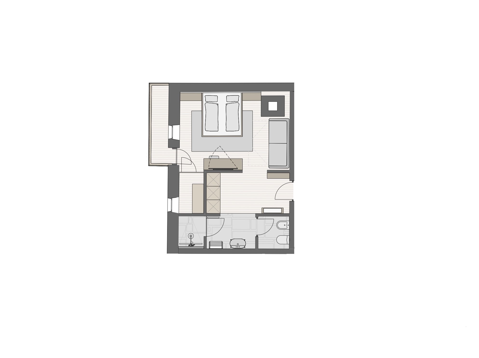 Il sonno buono si trova in questa camera. Diversi studi dimostrano un effetto salutare positivo apportato dal buon odore del legno. Ammobiliati con legno di cirmolo, le camere hanno una grandezza di 24 – 26m² e sono arredate con letto matrimoniale, divano, scrivania, bagno con doccia o vasca, pavimento in legno, balcone, TV, cassaforte, telefono, accesso internet gratuito, asciugacapelli, piccolo guardaroba e grande parte con portabagagli. Le camere offrono una magnifica vista verso le Dolomiti o le Alpi Centrali. La disposizione e l'arredamento delle stanze possono variare.